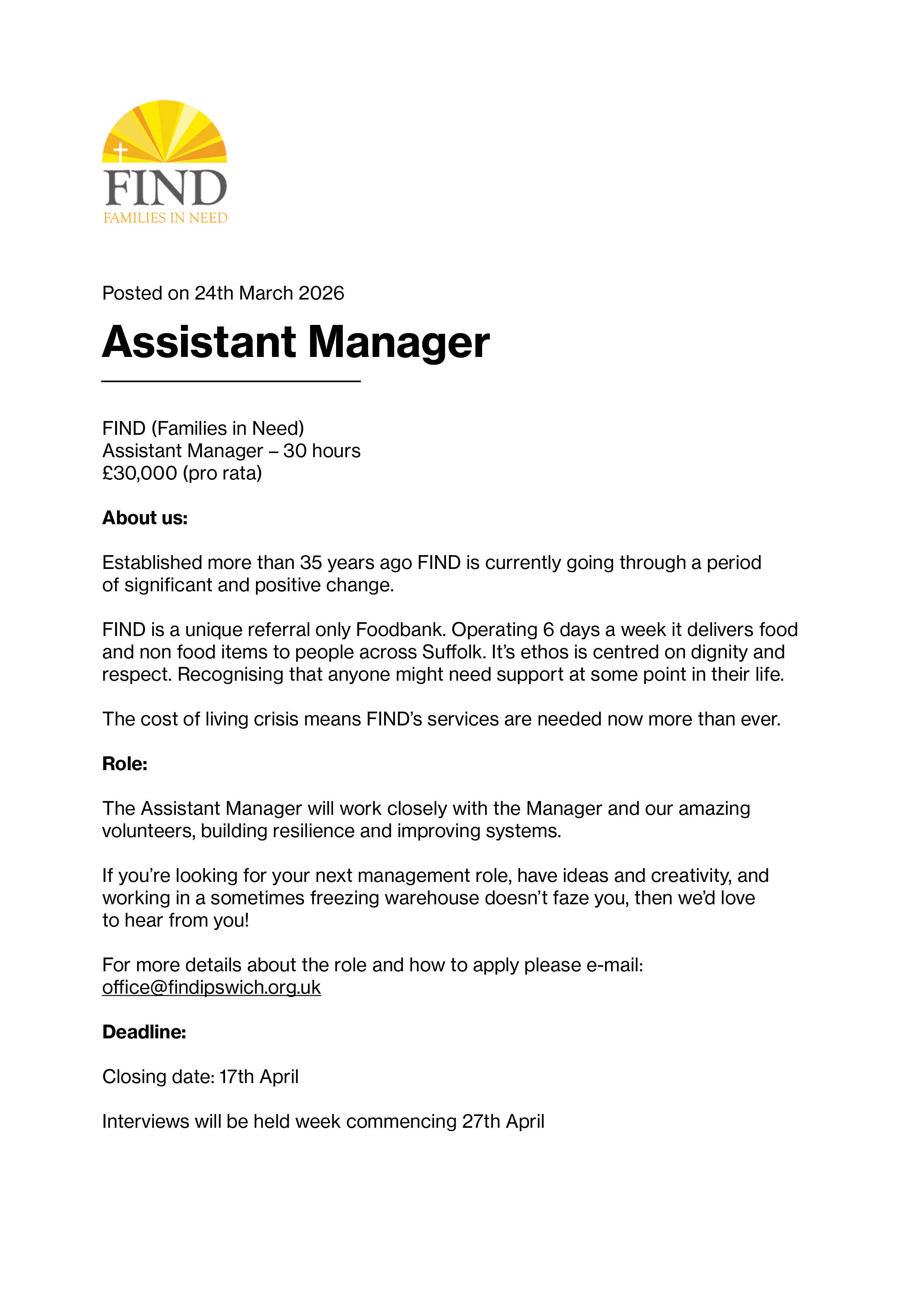 FIND was established as a registered charity in 1990 by Maureen Reynel MBE. We help those who are deprived of a minimum standard of living, whether they are single, families, lone parents, children, elderly, sick, disabled or homeless. We offer free of charge food, household items, furniture, nursery equipment and nappies, beds and bedding and, when available, cookers, washing machines and refrigerators. When appropriate, this includes personal support too.